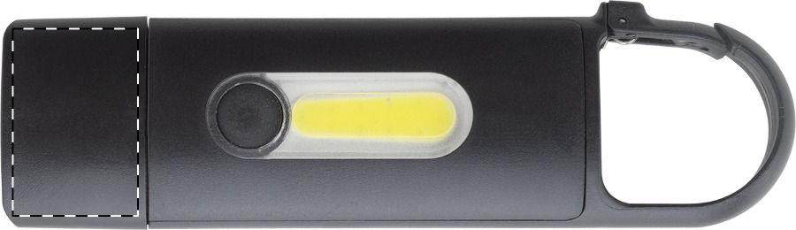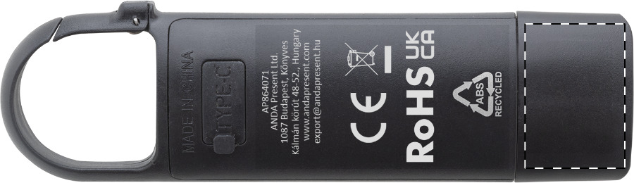Mini-Taschenlampe aus recyceltem ABS mit eingebautem USB-Akku (200 mAh) und Karabiner. Mit COB-Licht vorne und COB-Flutlicht an der Seite. Mit 3 Leuchtmodi. Inklusive USB-Ladekabel.
