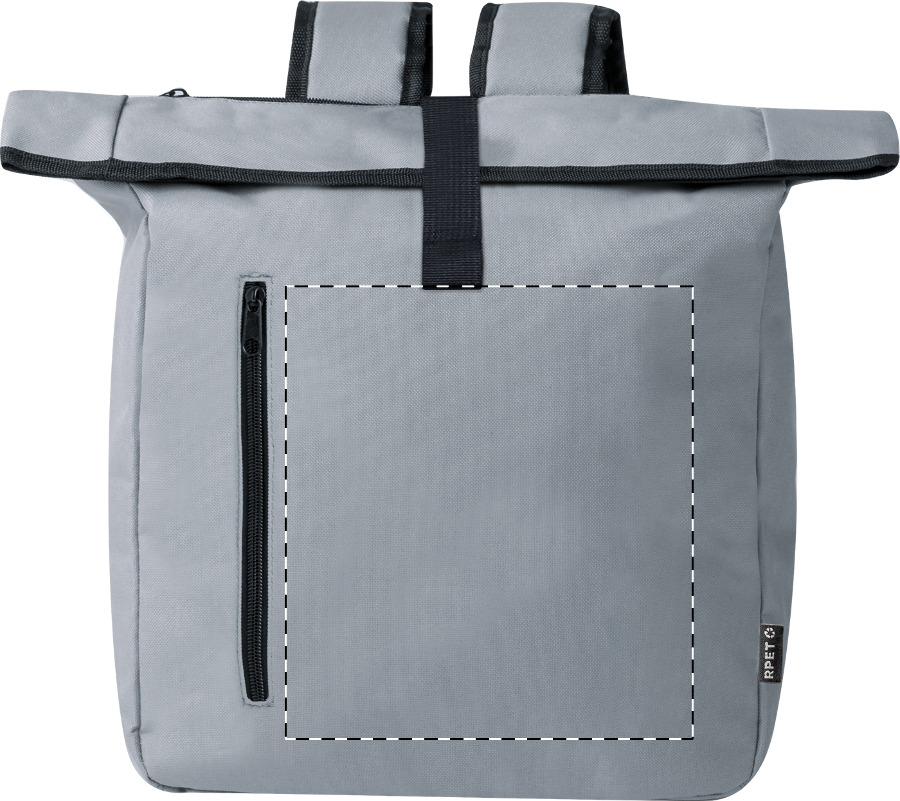 Fahrradrucksack aus 600D RPET-Polyester mit Reißverschlusstasche auf der Vorderseite und abnehmbaren gepolsterten Schultergurten. Mit versteckten Rahmenbefestigungsklammern.