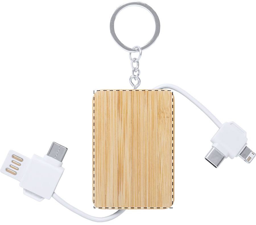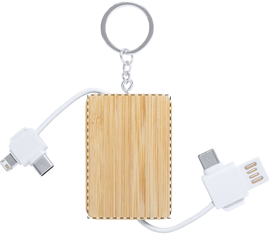 Ladekabel-Schlüsselanhänger aus Bambus mit Micro-USB-, USB-C- und Lightning-Anschlüssen. Mit USB- und USB-C Eingängen.