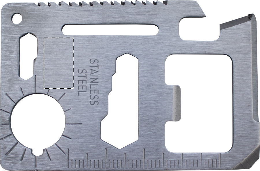 Multitool in Kreditkartenform aus Edelstahl, mit 11 Funktionen, in Kunstlederhülle.