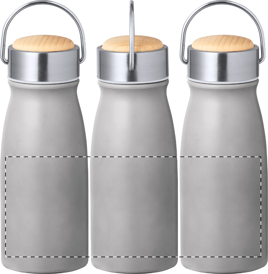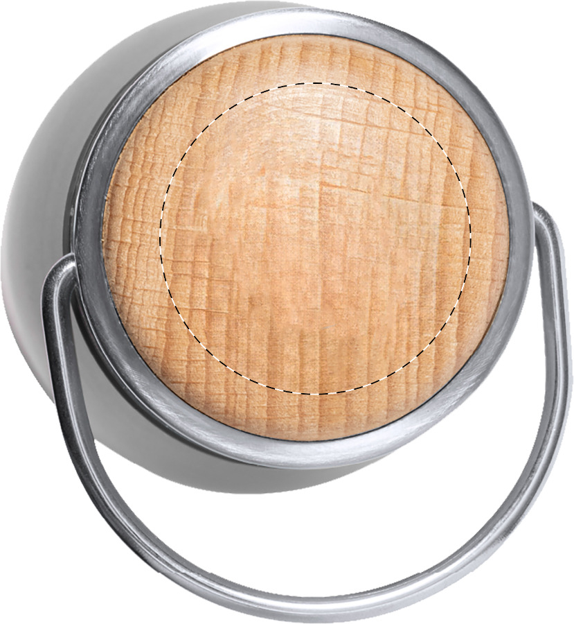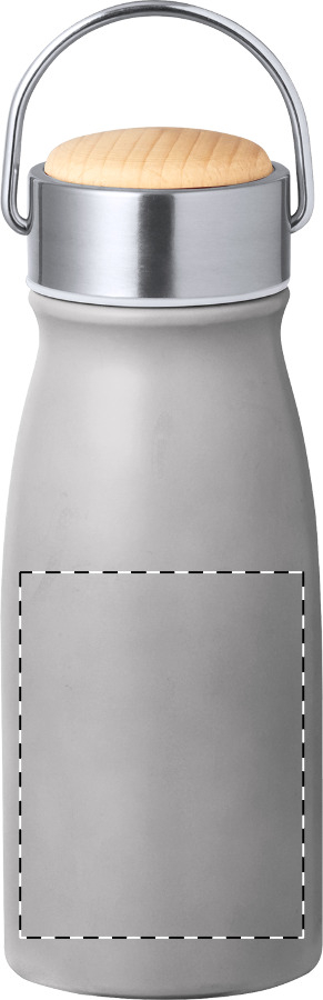 Doppelwandige Vakuum-Isolierflasche aus recyceltem Edelstahl mit Tragegriff aus Holz. Füllmenge: 350 ml.