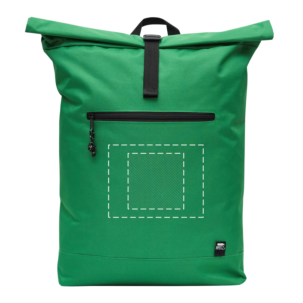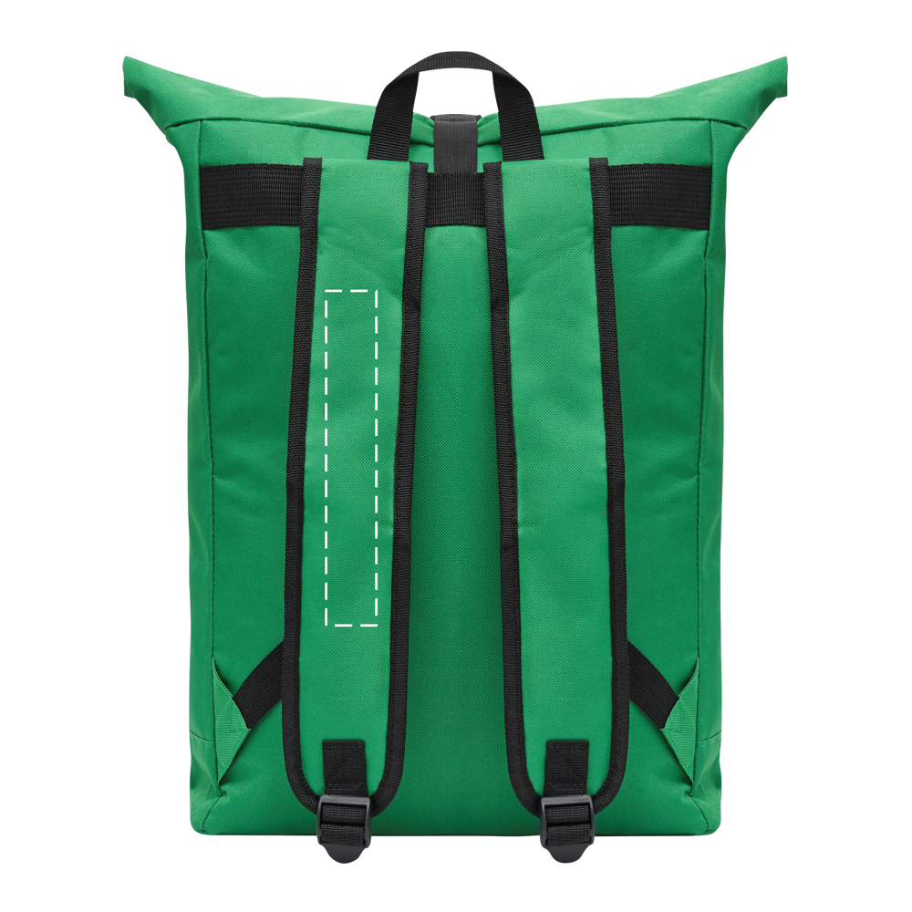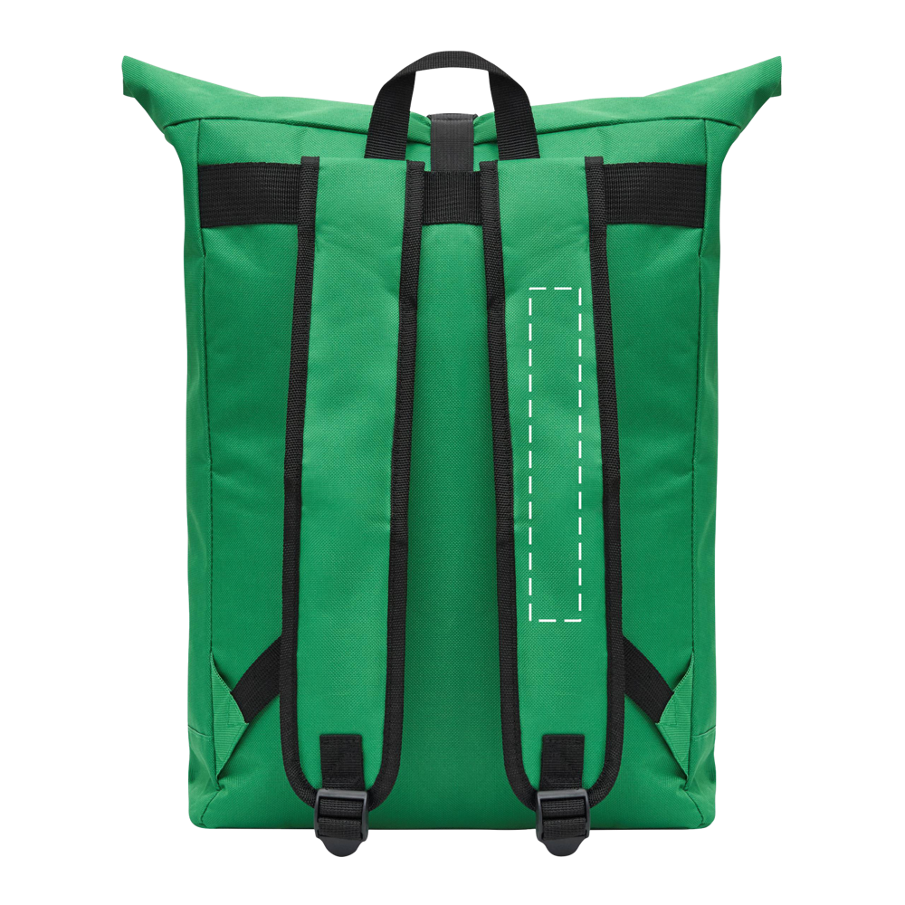 Rucksack ROLL-TOP: aus recyceltem Kunststoff (RPET), horizontales Reißverschluss-Vorfach, großes Hauptfach mit gepolstertem Innenfach für Laptop oder Tablet, aufrollbar und mit Schnappverschluss verschließbar, Trageschlaufe, gepolsterter Boden, Schultergurte und Rückenbereich