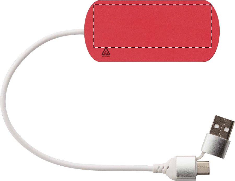 USB-Hub aus recyceltem Aluminium und recyceltem ABS mit 2 USB- und 1 USB-C-Anschluss, USB 2.0. Inklusive Kabel mit USB- und USB-C-Anschlüssen.