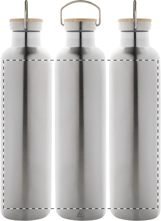 Doppelwandige, vakuumisolierte Flasche aus recyceltem Edelstahl mit Bambus-Tragedeckel. Füllmenge: 1000 ml.