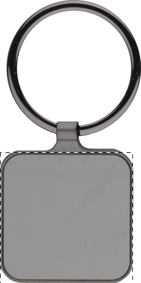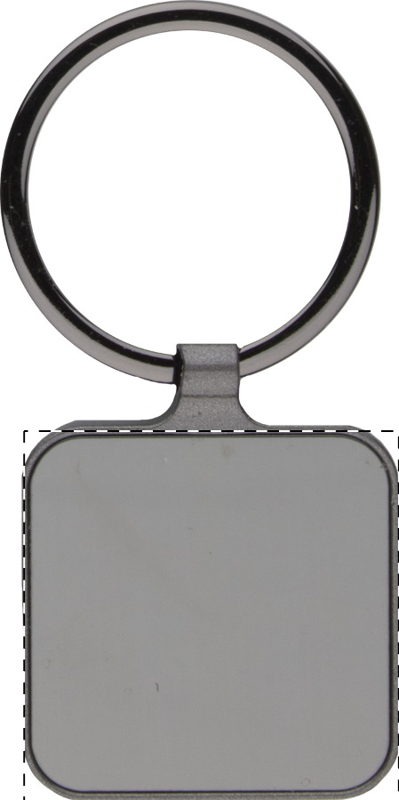Quadratischer Schlüsselanhänger aus Metall mit Gun-Metal-Oberfläche und polierten Plättchen auf beiden Seiten. Einzeln in schwarzer Geschenkbox.
